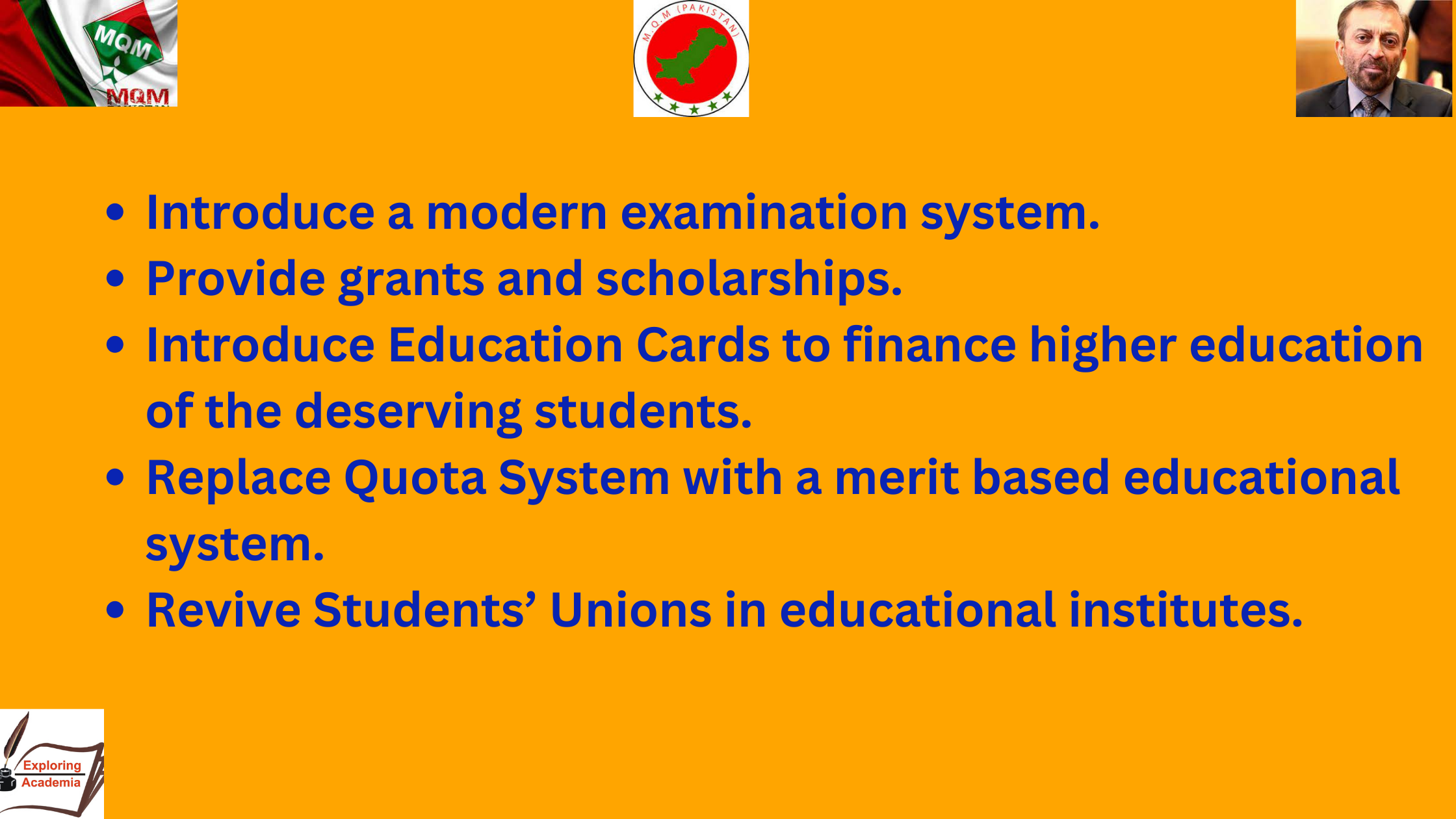 - MQM shall provide quality education through reformed curriculum and increased budgetary allocation.